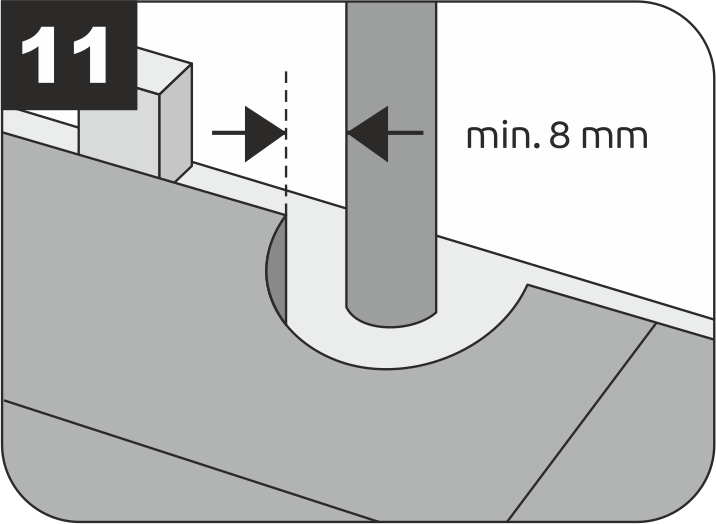 7.4.8 Необходимо соблюдать монтажные деформационные зазоры не менее 8 мм от края покрытия до всех выступающих из основания пола конструкций и элементов (трубы, дверные и оконные рамы, лестницы, колонны, перегородки, пороги, любые крепежные элементы и т.п.).