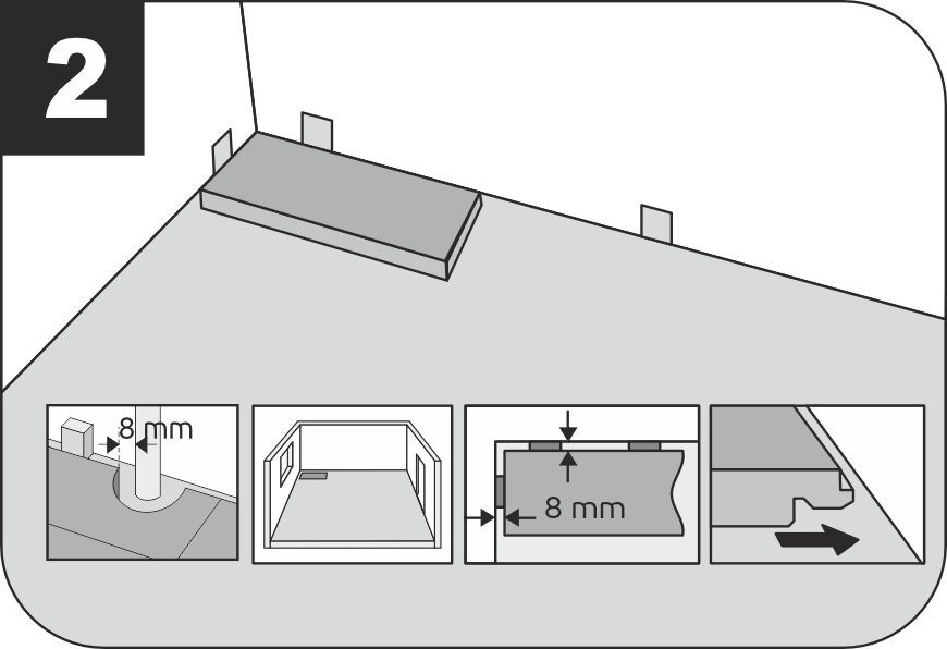 Необходимо соблюдать монтажные деформационные зазоры не менее 8 мм от края покрытия до стен и всех выступающих из основания пола конструкций и элементов. Укладка кварцевого ламината начинается с формирования первого «маякового» ряда. От ровности его монтажа зависит ровность и качество всей укладки