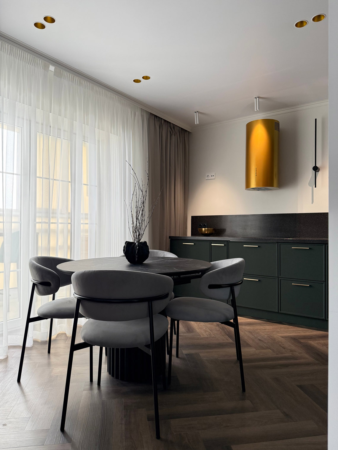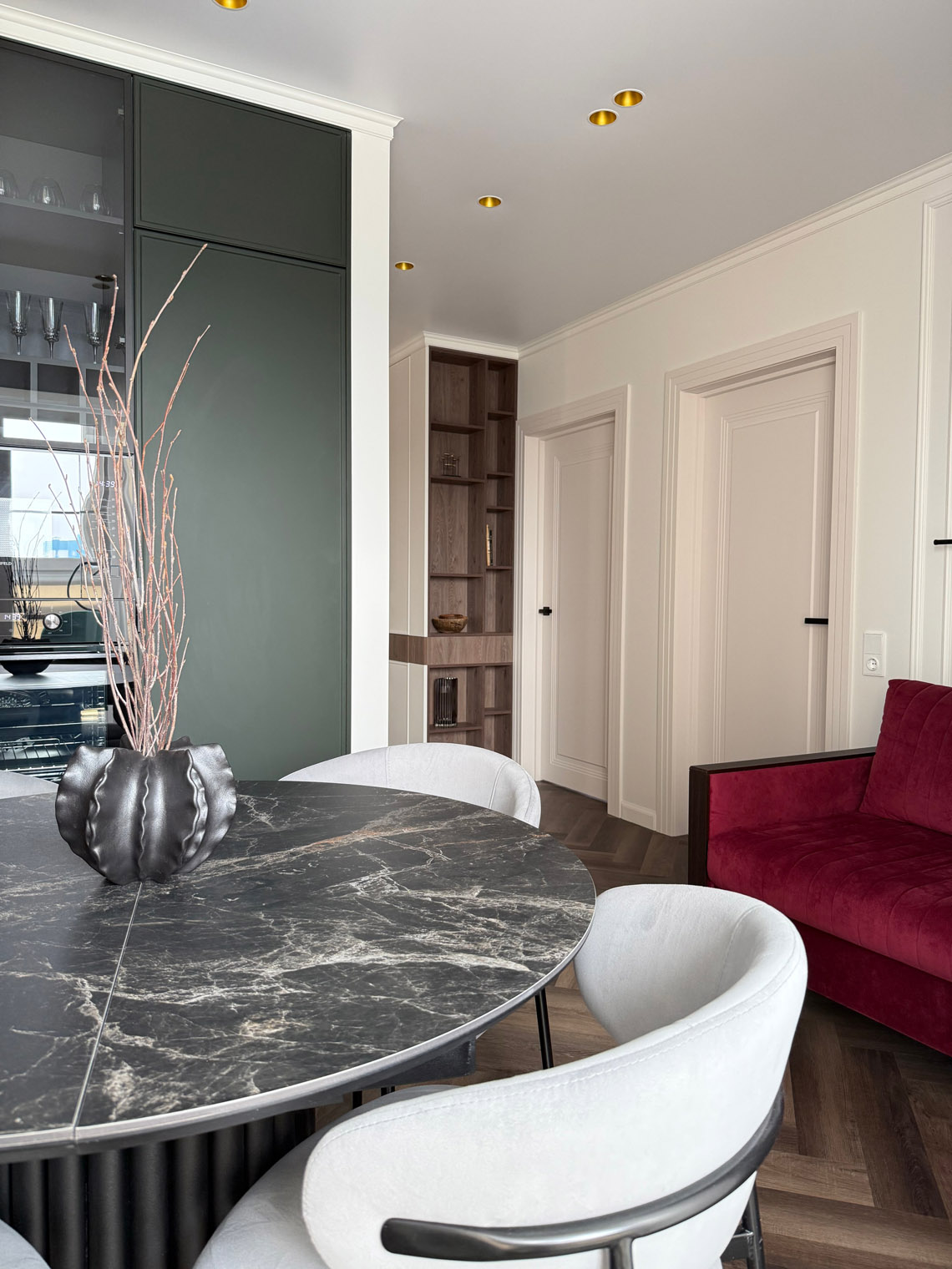 В основе этого интерьера — смелый контраст: белоснежные стены + темная мебель. То, чего многие избегают, здесь выглядит безупречно. Кварцевый ламинат в укладке мелкой «ёлочкой» добавил пространству графичности и поддержал насыщенную цветовую палитру.
